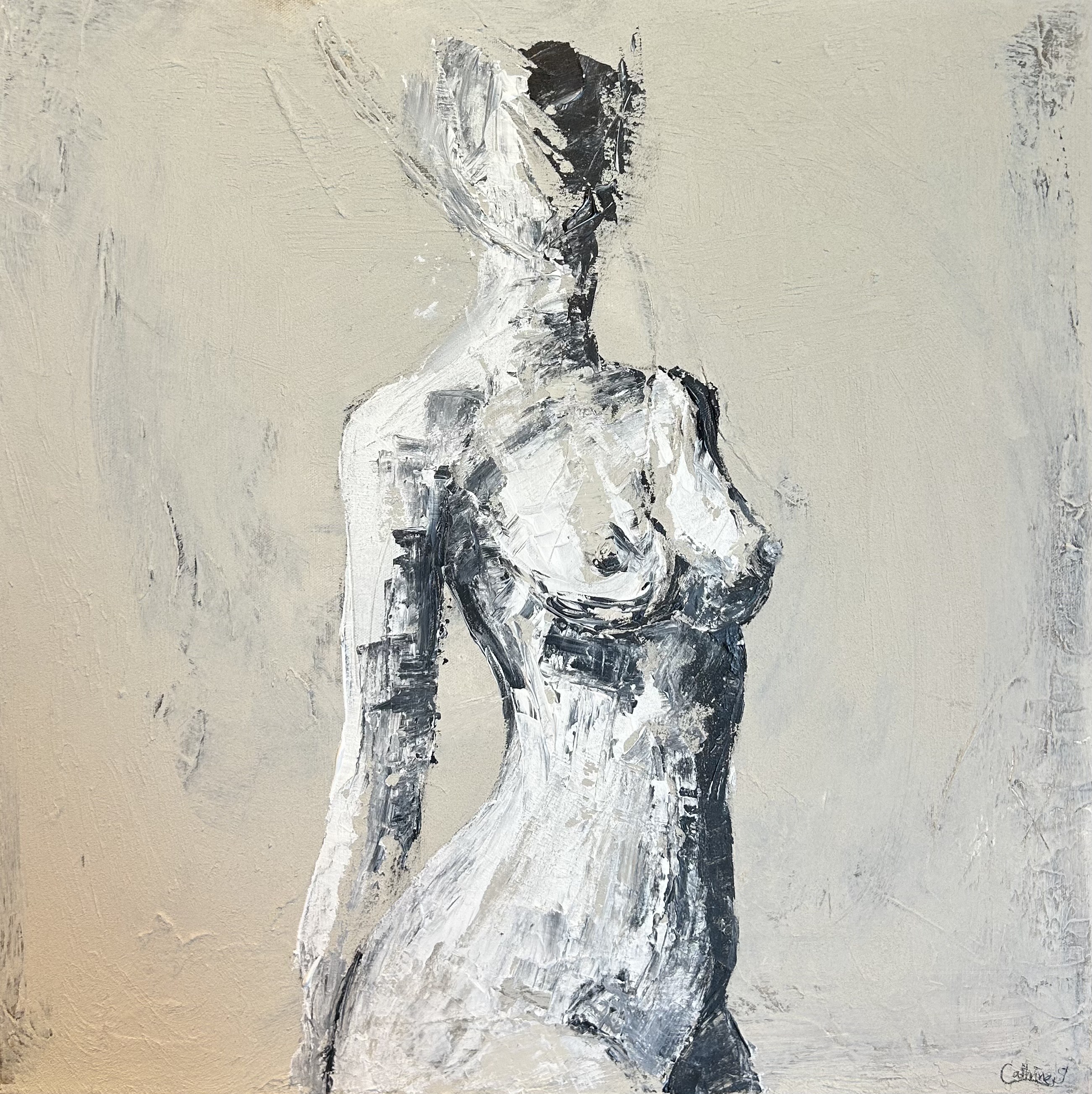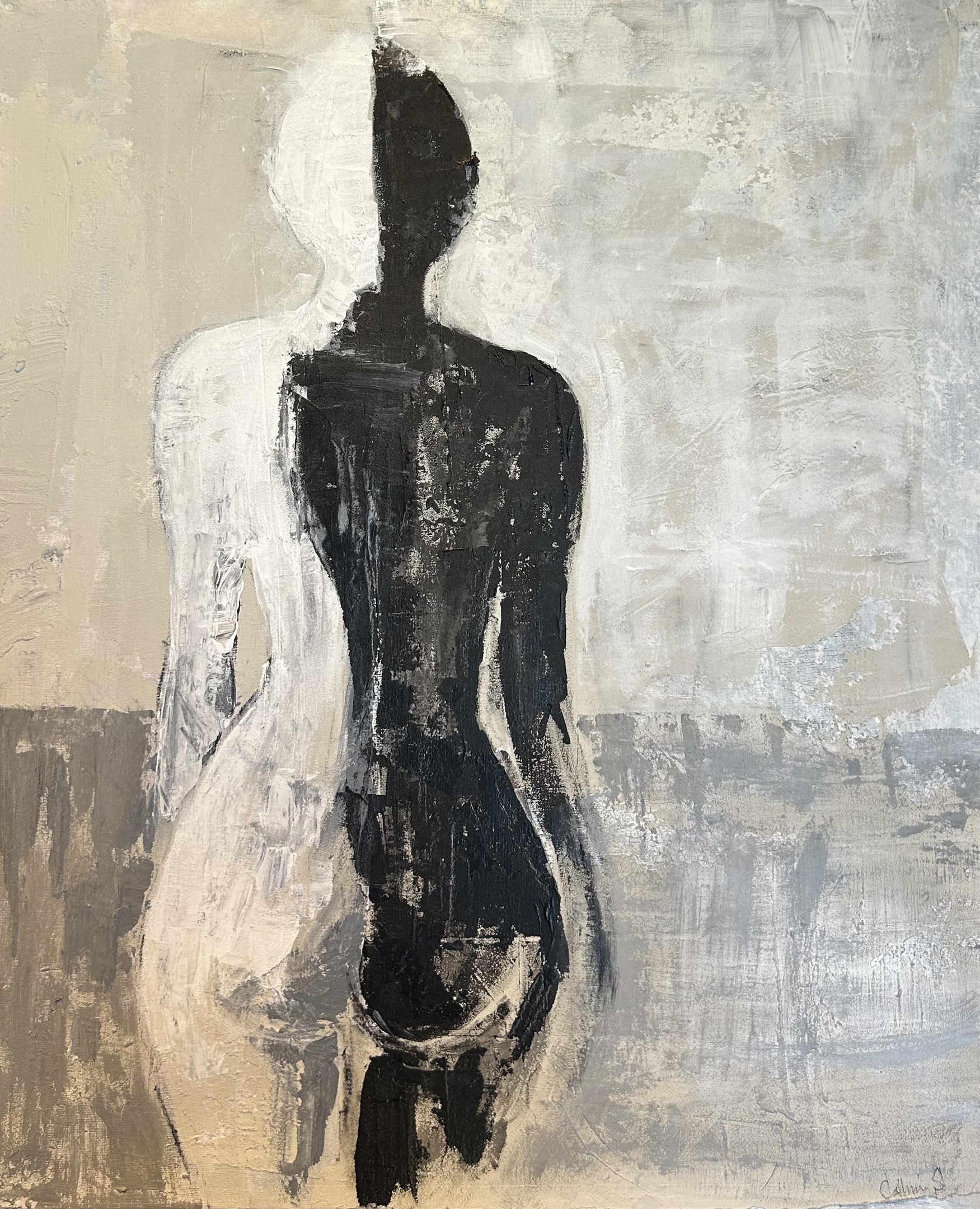 Shadow Collection består av unika originalverk där struktur och kontrast är grunden. Varje målning byggs upp lager på lager med spackel, cement och andra texturmaterial och färgpaletten är avskalad och hålls inom svart, offwhite och jordnära toner. I mötet mellan ljus och mörker framträder mänskliga och abstrakta former – det synliga och det som bara anas.